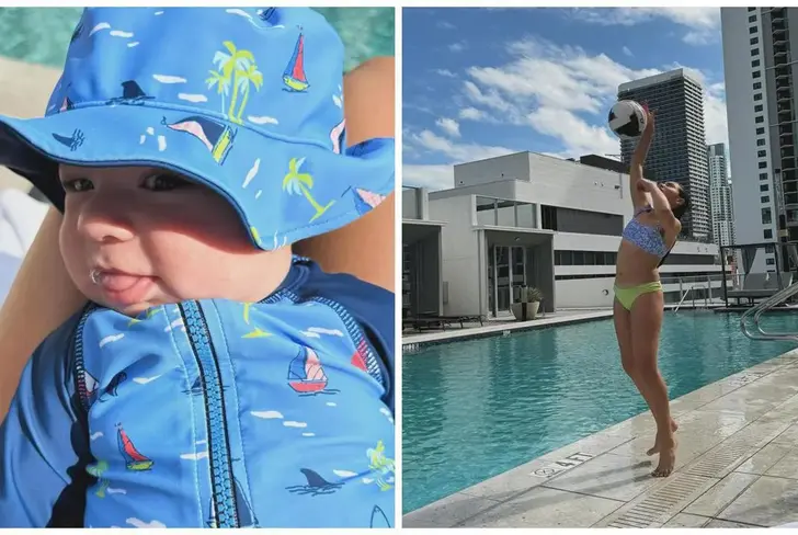 Su pequeño Lorenzo protagonizó las fotos con un tierno atuendo playero, mientras que ella, su hija Salomé y su pareja, mostraron su agilidad en una espontánea partida de voleibol, llamando de sobremanera la atención con su espectacular figura, la cual lució con un bikini azul con estampado floral, revelando un abdomen completamente plano y tonificado.