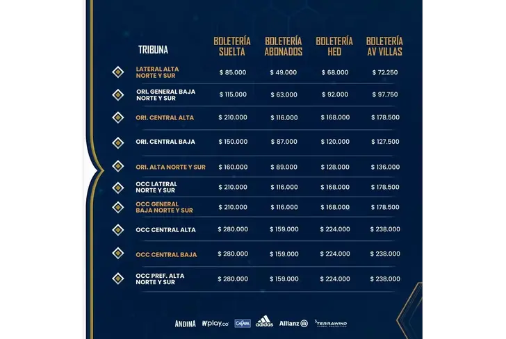 La ticketera oficial del club albiazul ha presentado cuatro listas de precios, otorgando mayores beneficios a los hinchas que se abonaron en 2023, para quienes los precios oscilan entre 49.000 y 159.000 pesos colombianos. En contraste, aquellos que se abonaron en 2024 deberán asumir el valor más alto, el cual va desde 85 mil hasta los 280 mil pesos colombianos.