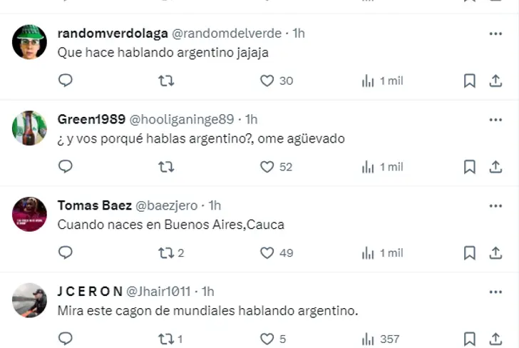 Sin embargo, lo que más llamó la atención más allá de sus declaraciones fue el acento con el que las hizo, ya que muchos colombianos lo están criticando por al parecer estar usando un acento bastante argentino, a pesar de que su origen sea del Chocó en el Valle del Cauca y esto ha generado malestar en los internautas cafeteros. (VEA EL VIDEO AQUÍ)