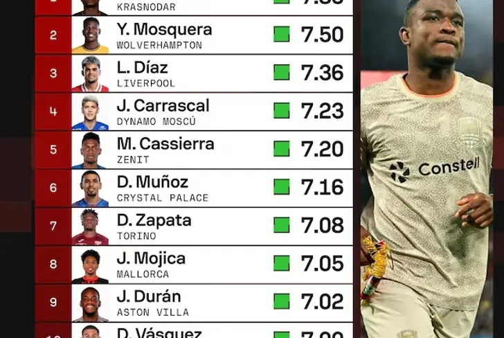 Otros colombianos destacados en el ranking de SofaScore fueron Jorge Carrascal, Mateo Cassierra, Daniel Felipe Muñoz, Duván Zapata, Johan Mojica, Jhon Jader Durán y Devis Vásquez. Este último, arquero del Empoli, llamó la atención por mantener su arco invicto durante todo el mes.