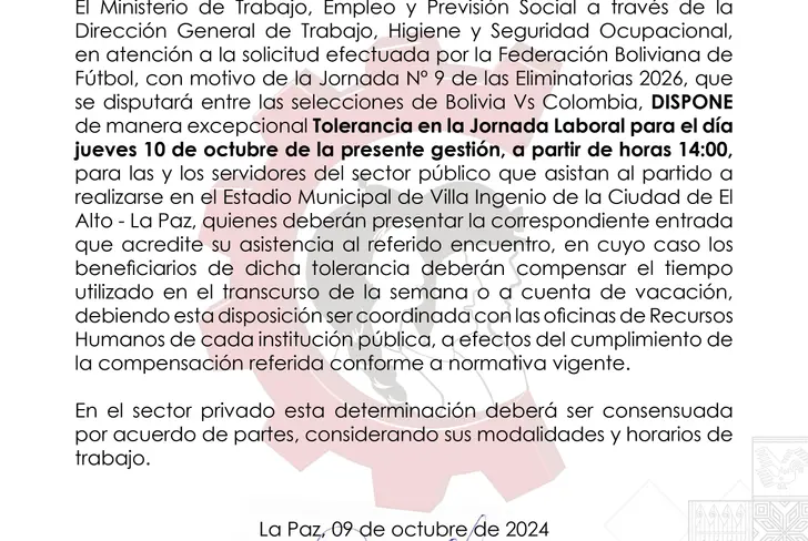 El Ministerio de Trabajo ha emitido un comunicado oficial en el que se establece una tolerancia laboral a partir de las 14:00 horas, permitiendo a los servidores públicos asistir al encuentro en el estadio Municipal de Villa Ingenio, en El Alto. Para hacer efectiva esta medida, los trabajadores deberán presentar su entrada al partido.