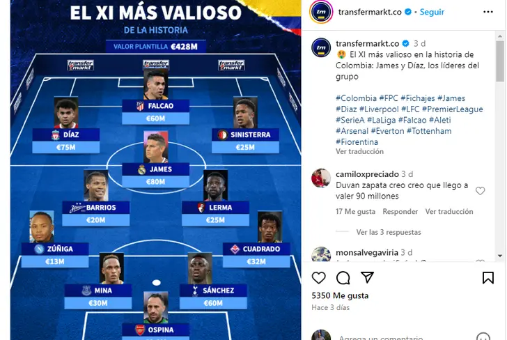 El valor total de esta plantilla asciende a la impresionante cifra de 428 millones de euros. Jugadores como Duván Zapata, cuyo valor llegó a alcanzar los 45 millones de euros en su momento, estuvieron cerca de ser incluidos en este ‘once ideal’, demostrando el talento y la calidad que caracteriza a la selección colombiana en el ámbito internacional. Así quedaría el onceno: