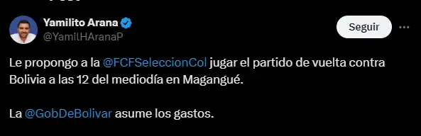 El gobernador de Bolívar, Yamil Arana, ha encendido la mecha de la polémica en el fútbol colombiano al proponer que el partido de vuelta de la Selección Colombia contra Bolivia se dispute en Magangué, a las 12 del mediodía. La idea, según el mandatario, es aprovechar las altas temperaturas de la región para contrarrestar la ventaja que Bolivia obtuvo al jugar en la altura de El Alto.