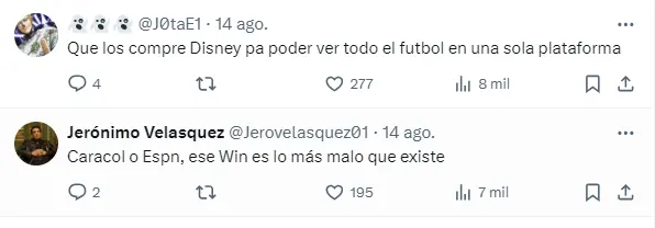 Por su parte, los usuarios en las redes sociales han levantado su voz para expresar su descontento con la gestión de Win Sports y hasta se atrevieron a postular a las cadenas a las cuales les gustaría que se les adjudicara los derechos. Entre los más mencionados estuvieron Caracol TV, ESPN y hasta Disney.