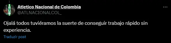Varios usuarios de X comentaron la presentación de Efraín Juárez en Atlético Nacional con comentarios como “Ojalá todos tuviéramos la suerte de conseguir trabajo rápido sin experiencia” o “Jajajajajajajajajajajajajaja, éxitos en tú primera experiencia. Que chimba conseguir un excelente trabajo sin tener experiencia, envidiable”, haciendo referencia a la poca experiencia que tiene el nuevo técnico del club.
