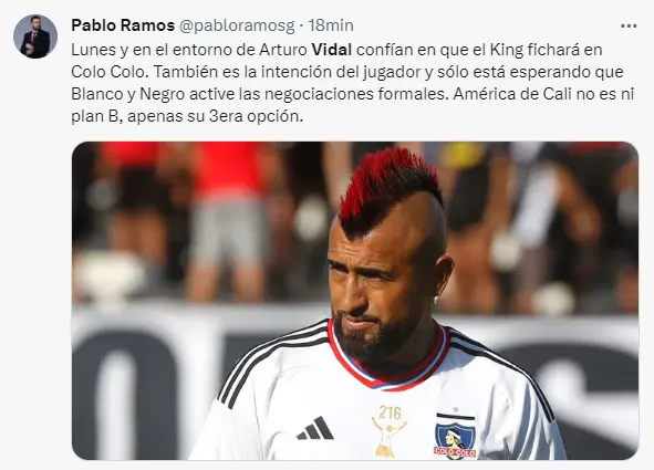 Esto se debe a que el club chileno parece estar dispuesto a hacer un esfuerzo para contar con el exjugador del Barcelona, pues indican que América fue informado de una oferta de Colo Colo por Vidal y, aunque el equipo colombiano ha hecho un gran esfuerzo en las negociaciones, la situación aún no está asegurada.