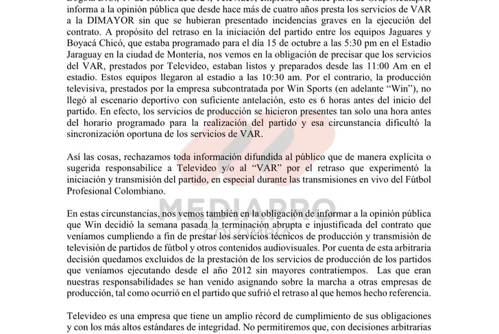 "La decisión de Win Sports de terminar el contrato se debe a la falta de cumplimiento por parte de la empresa de producción, lo que generó un retraso injustificado en el inicio del partido y perjudicó a nuestros espectadores", afirmó un portavoz de Win Sports.